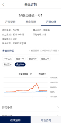 產品展示:向合格投資者展示產品業績,如產品凈值、年度業績、回撤、風險評測等全方面的產品業績