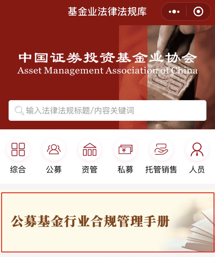 協(xié)會(huì)《公募基金行業(yè)合規(guī)管理手冊(cè)》在“中國(guó)基金業(yè)法律法規(guī)庫(kù)”小程序 中正式上線(xiàn)